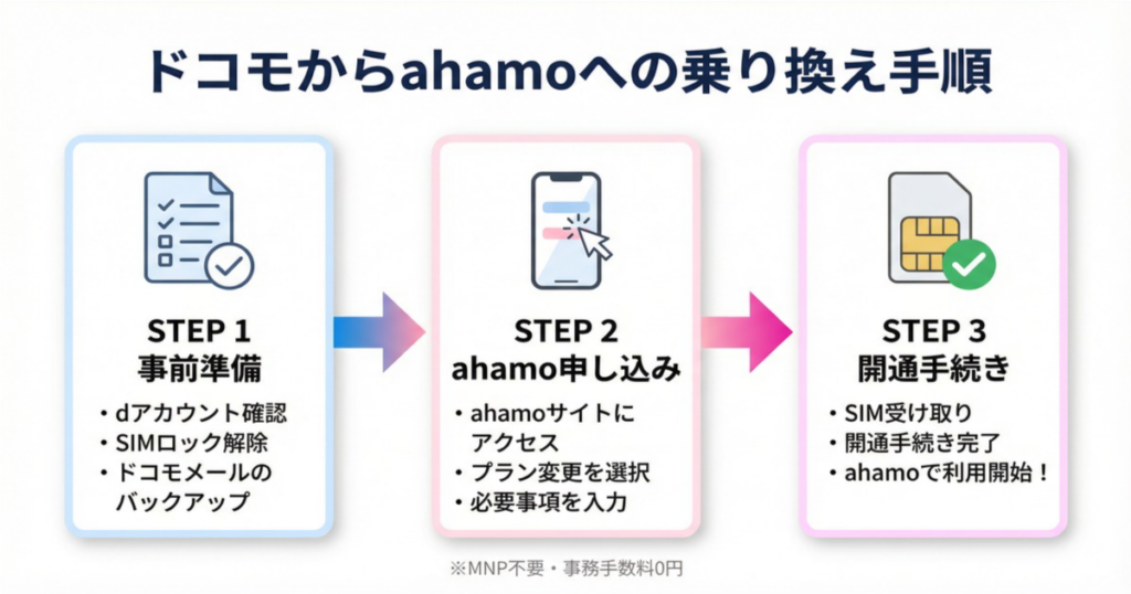 ahamoはドコモの料金プランの一つなので、実はMNP予約番号もSIMロック解除も不要で、驚くほど簡単に乗り換えが完了します。