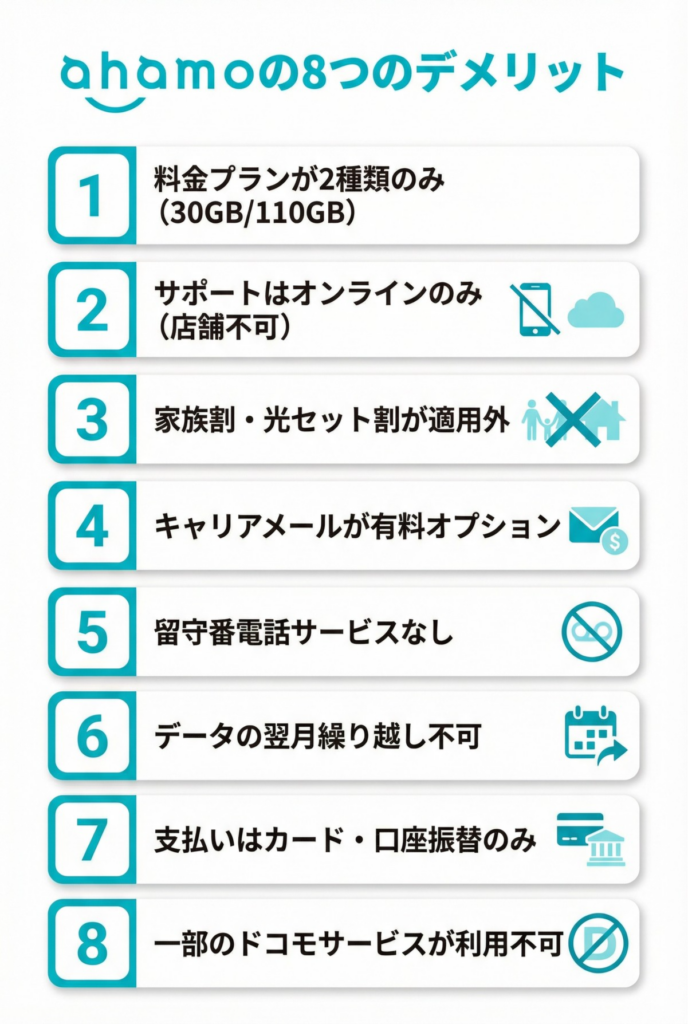 しかし、契約してから「こんなはずじゃなかった…」と後悔しないために、ahamoが持つデメリットや注意点を事前にしっかり理解しておくことが非常に重要です。特に、サポート体制やドコモ本家とのサービスの違いには注意が必要です。