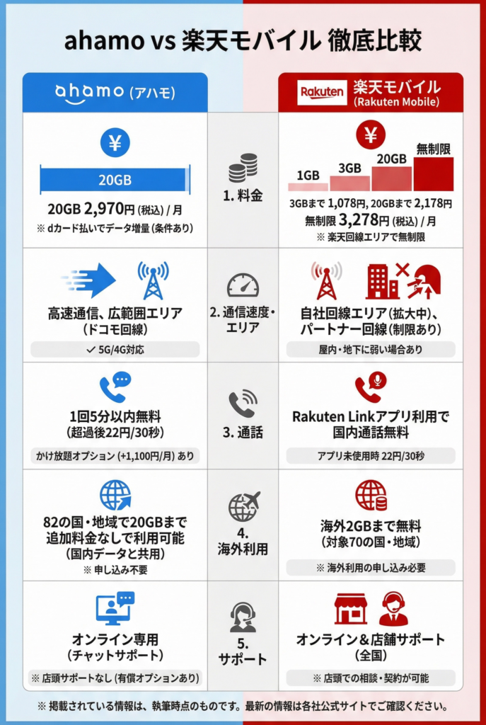 この記事では、2026年3月時点の最新情報をもとに、料金・通信速度・通話品質・海外利用・サポートの5つの重要なポイントから、ahamoと楽天モバイルを徹底的に比較します。この記事を読めば、あなたに最適なプランが必ず見つかります。