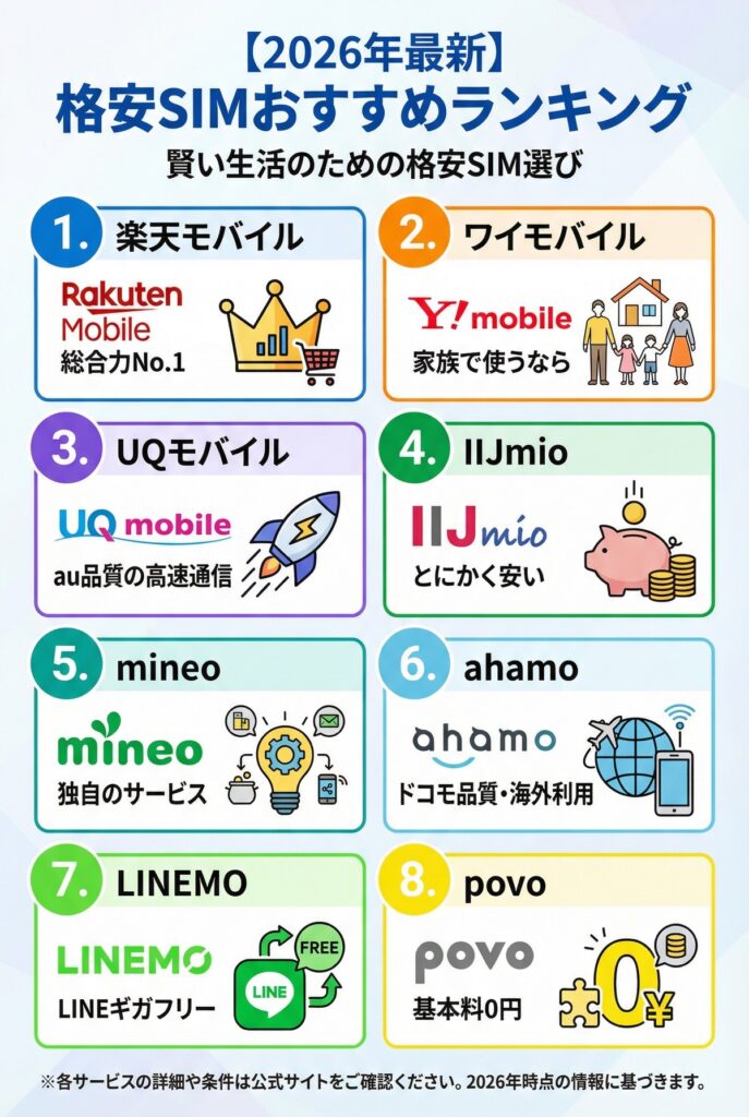 そこでこの記事では、数ある格安SIMの中から2026年3月時点で本当におすすめできる8社を厳選し、ランキング形式でご紹介します。「料金の安さ」「通信速度」「サポート体制」「キャンペーン」の4つのポイントから徹底比較し、あなたの使い方にぴったりの格安SIMが必ず見つかります。