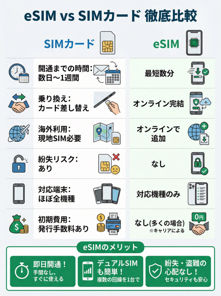 💡 まとめると: eSIMは「手軽さ・速さ・柔軟性」に優れており、SIMカードは「対応端末の広さ・実績」に優れています。どちらが良いかは使い方や端末によって異なります。